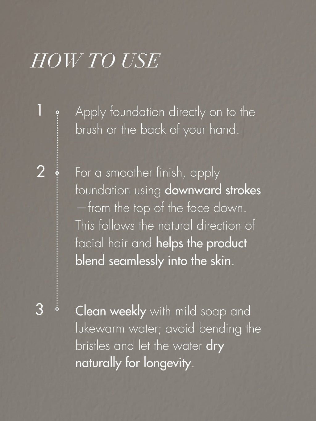Apply foundation either to the back of your hand or directly to the brush and use downward strokes from the top of the face for a smoother finish. This follows the natural direction of facial hair and helps the product blend seamlessly into the skin. Clean weekly with mild soap and warm water but avoid bending the bristles and let the brush dry naturally.